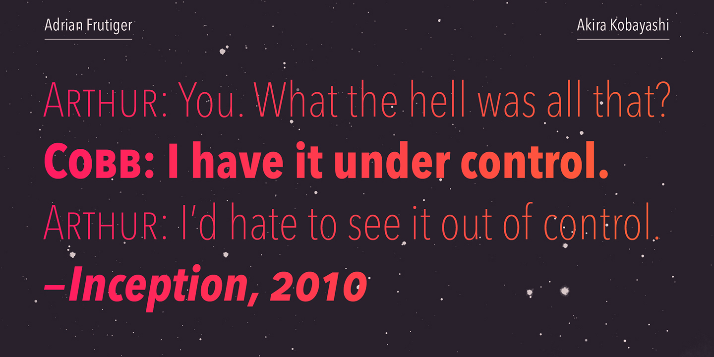 Akira Kobayashi đã làm việc cùng với người sáng tạo để tạo ra Avenir, Adrian Frutiger để đưa Avenir Next Pro vào mọi loại thiết kế. Chính khả năng của Akira trong việc đưa sự khéo léo và ý tưởng của riêng mình để mở rộng vào dự án trong khi vẫn đúng với ý định ban đầu của Frutiger, điều này khiến đây không chỉ là một kiểu chữ hiện đại mà còn đi trước thời đại.