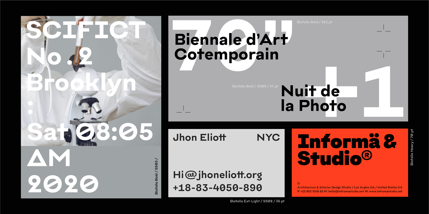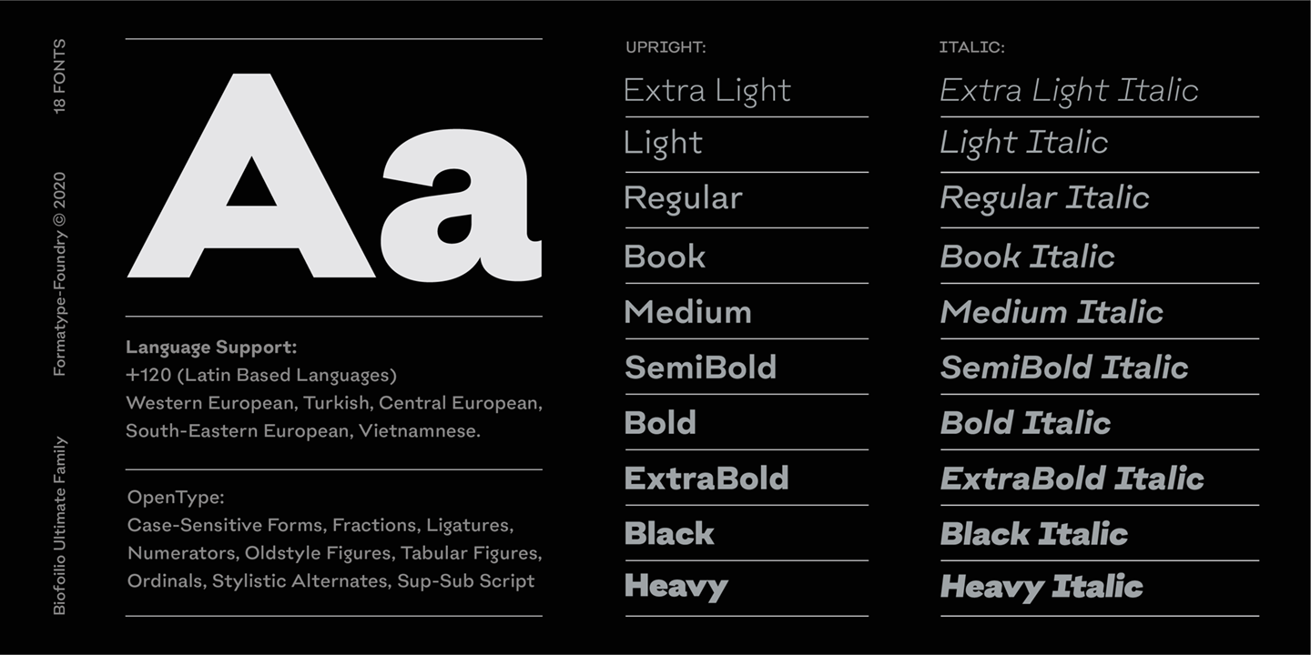 Comes with 10 italic matching weights – 20 fonts in all, Biofolio Ultimate supports around 150 different languages, designed with many OpenType features, such as powerful alternative styles, forms case sensitive, contextual and stylistic substitution. The standard numeral set includes symbols and tabular numbers, numerators and denominators, plus fractions.