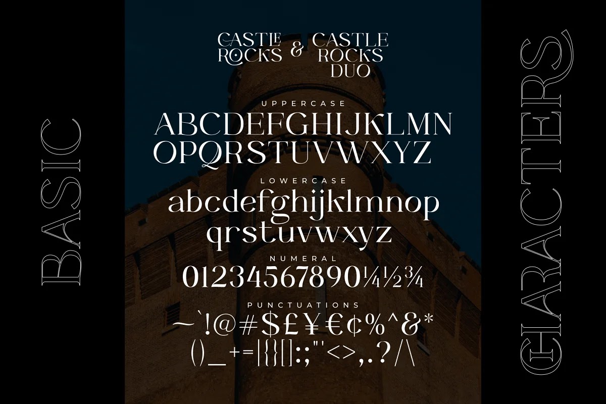 - CASTLE ROCKS DUO (Phông chữ thông thường), font chữ thông thường này không có tính năng ghép nối để bạn có thể kết hợp với CASTLE ROCKS hoặc sử dụng để làm font chữ văn bản, phông chữ này có 4 kiểu chữ regular, italic, bold, và bold italic.