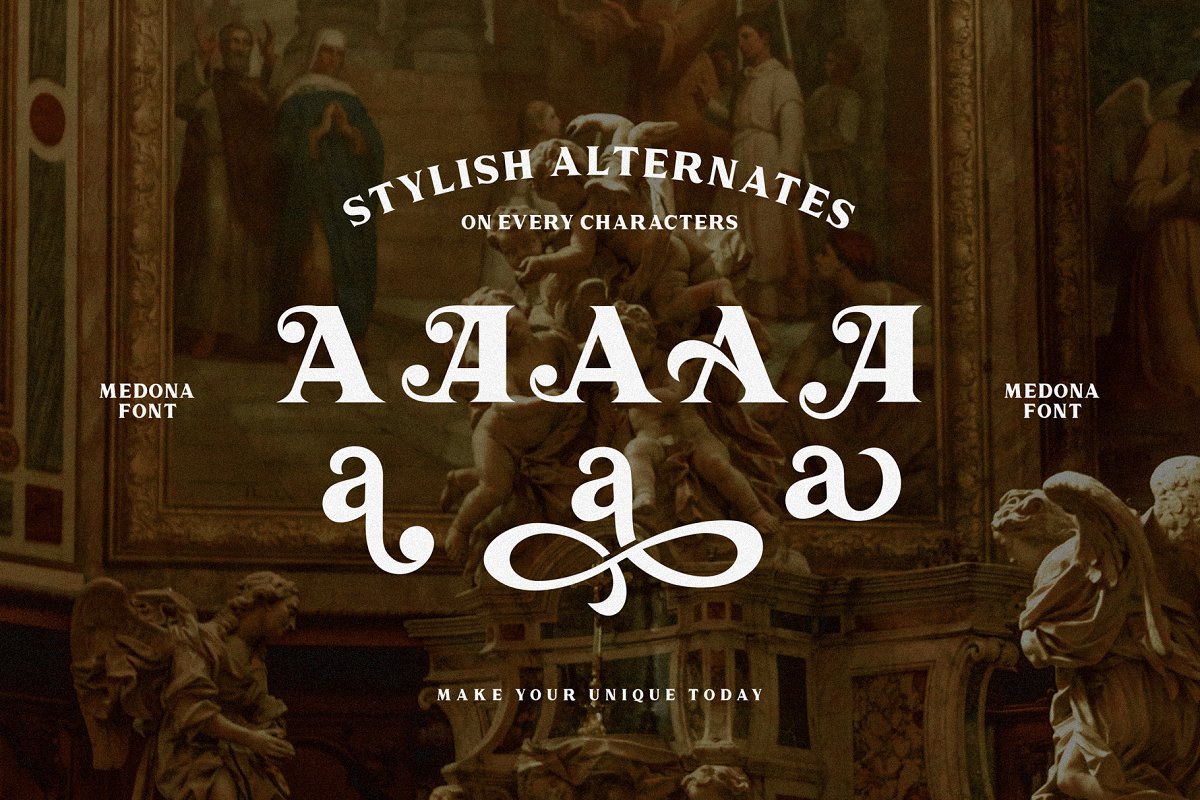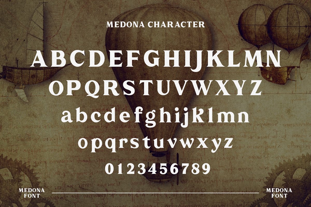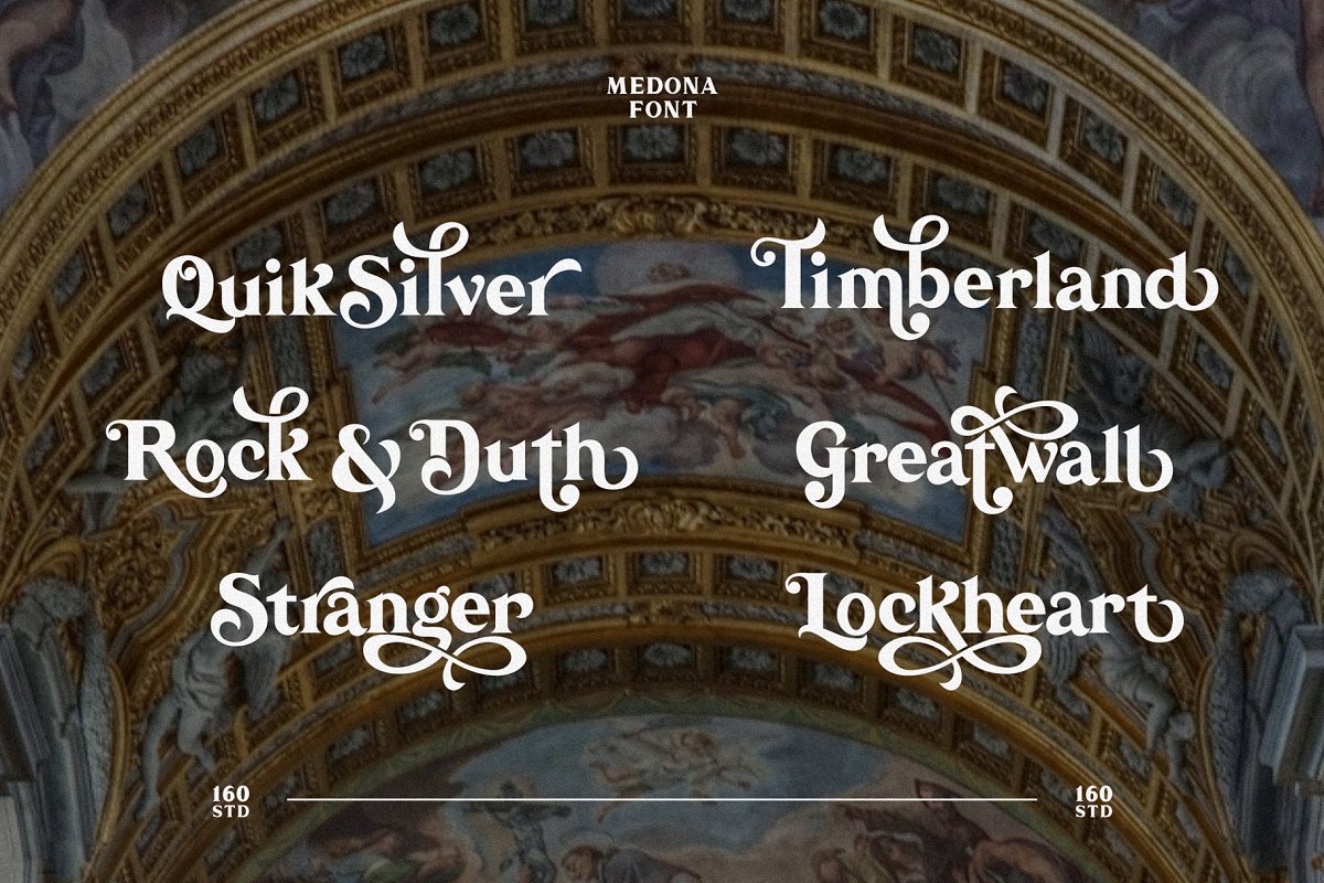 Mỗi chữ cái có một số đồ trang trí trang trí hoạt động đẹp mắt để tăng cường cho phông chữ Medona, các chi tiết thông thường. Phông chữ này có đủ ký tự cho logo và thương hiệu, cũng như các tiêu đề, trang trí và nhiều hơn nữa.