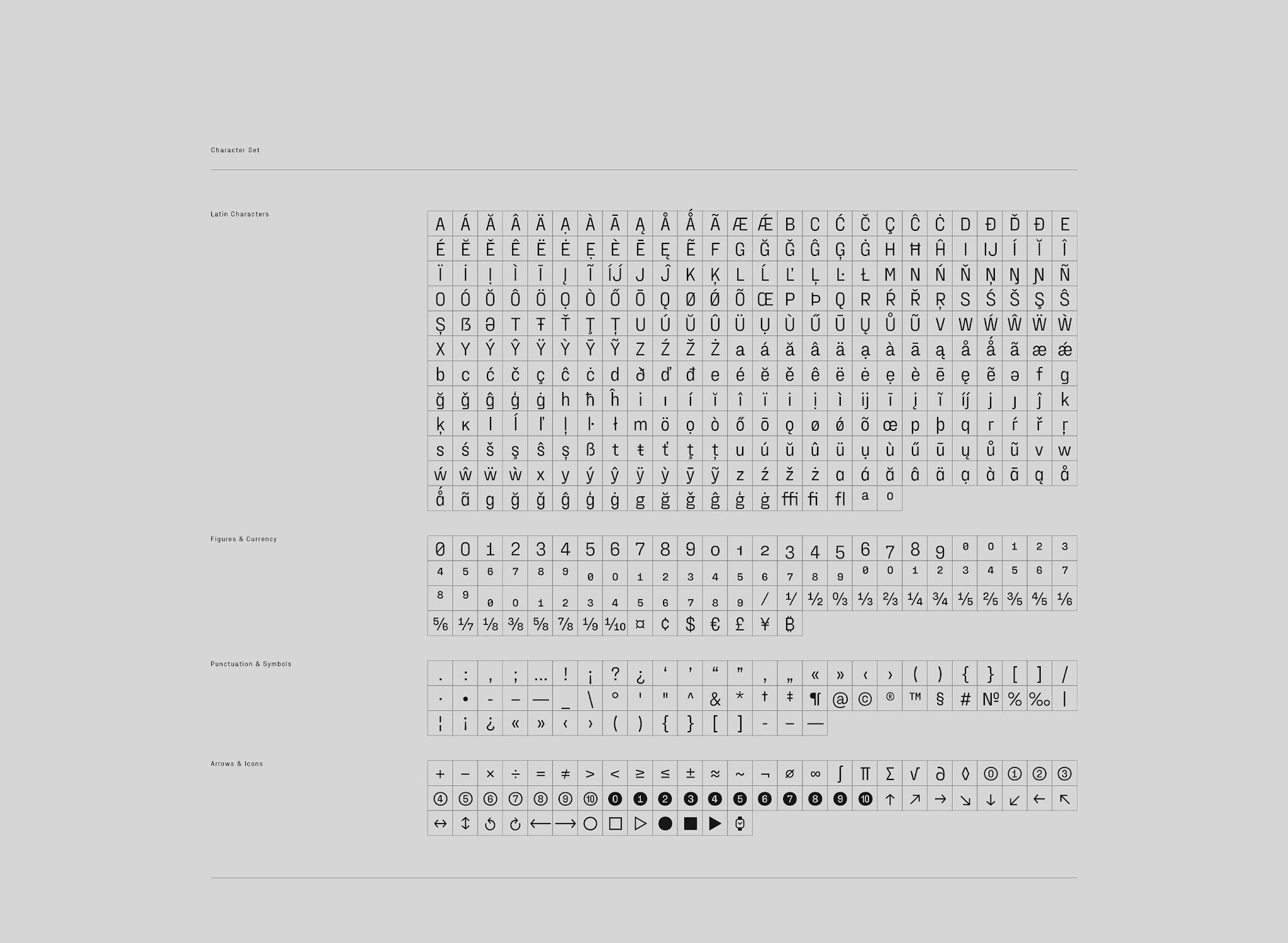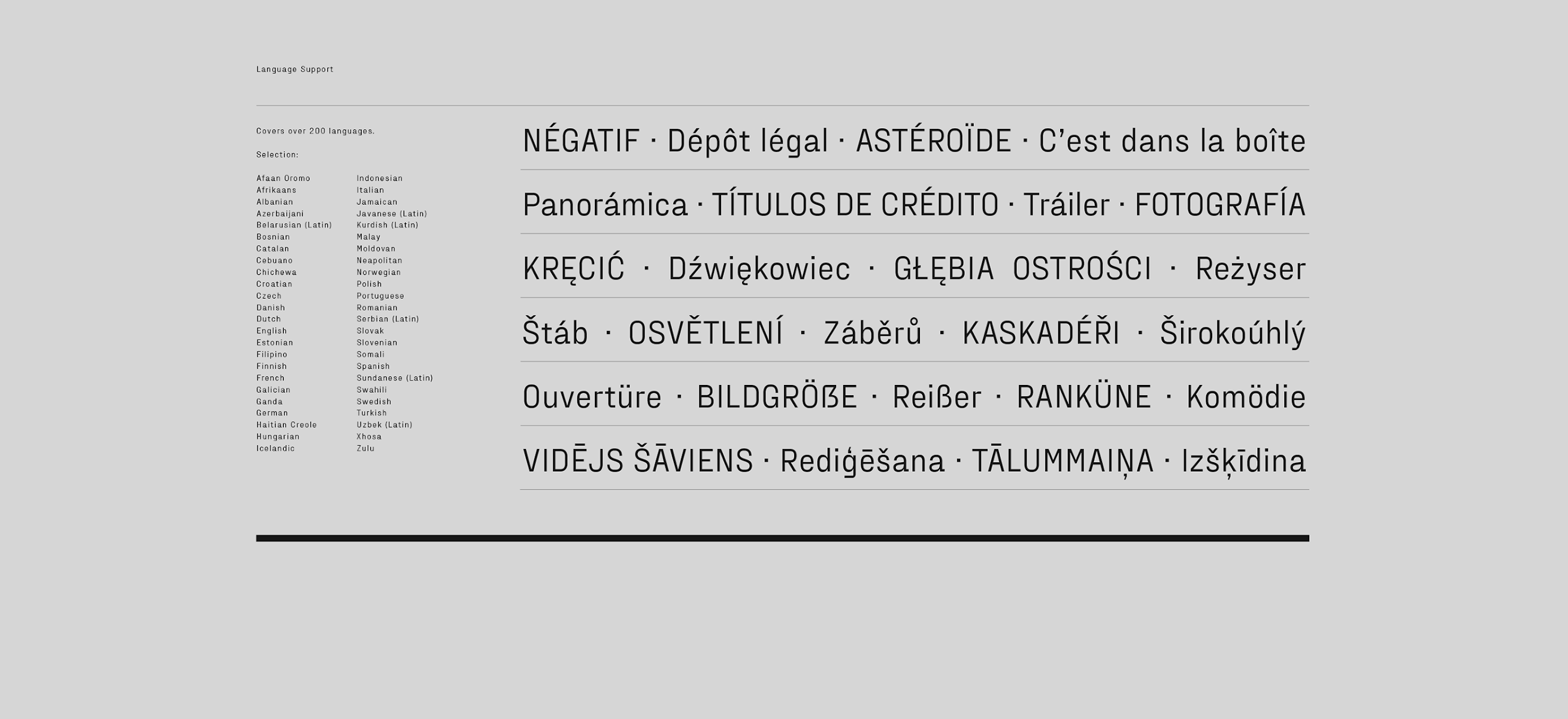 Bộ font bao gồm 10 kiểu với 603 glyphs mỗi kiểu. Hỗ trợ hơn 200 ngôn ngữ.