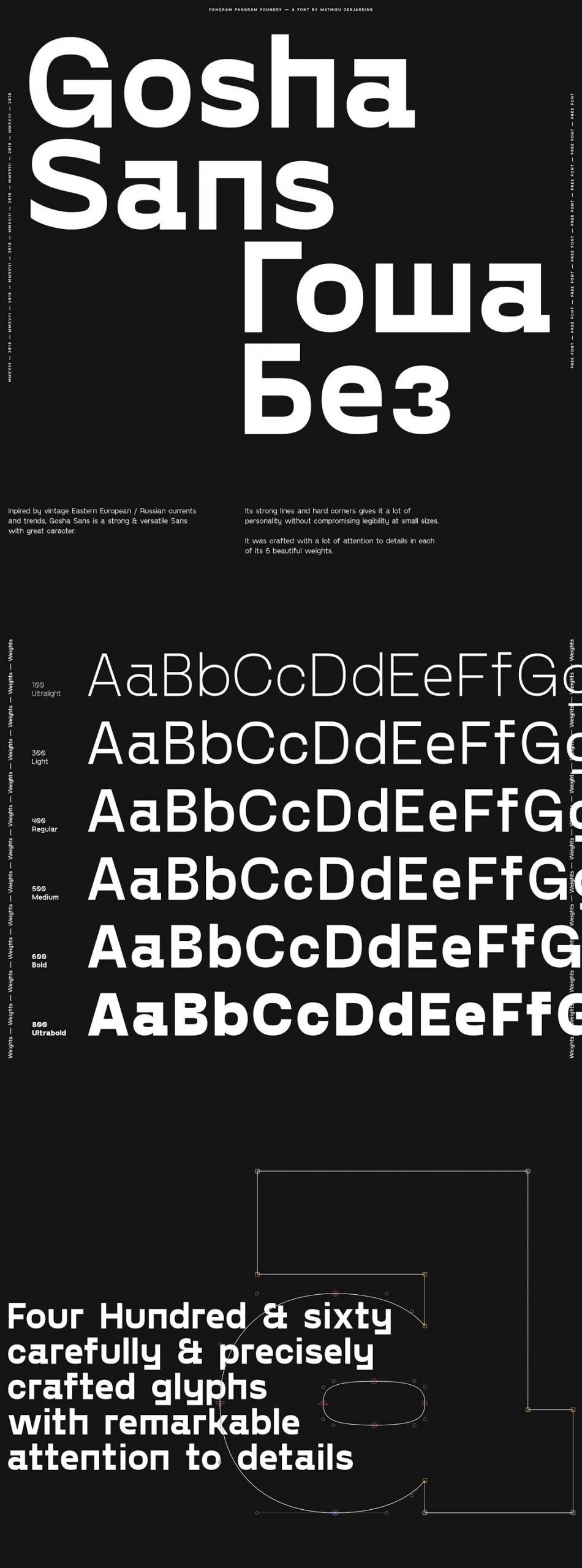 Gosha Sans Font Family bao gồm 6 style với 620 glyph mỗi kiểu. Hỗ trợ ngôn ngữ cho Châu Mỹ, Nga và hầu hết Châu Âu. Thiết kế bởi Mat Desjardins.