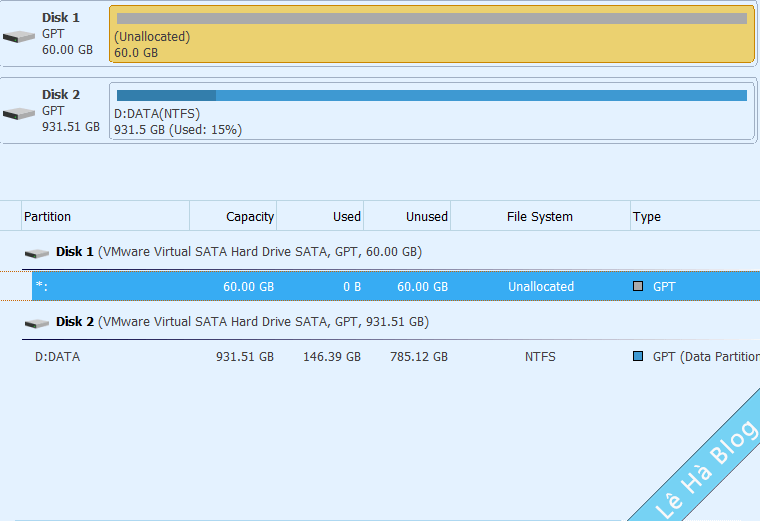 Bạn hãy tạo ra 1 phân vùng Unallocated với dung lượng khoảng 50GB trở lên. Tùy theo nhu cầu sử dụng của bạn.