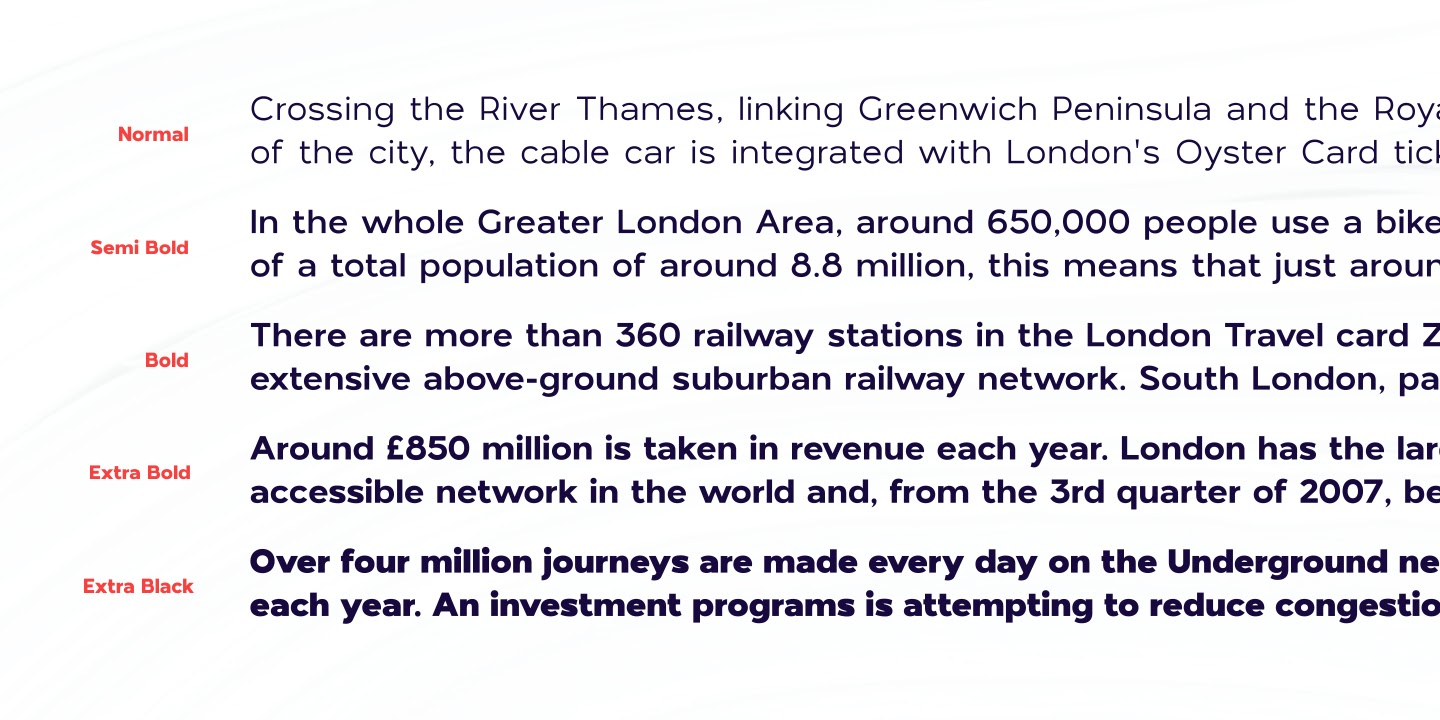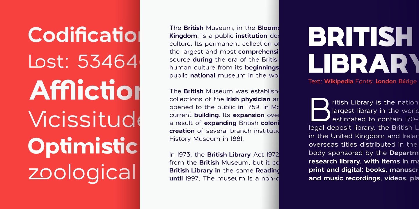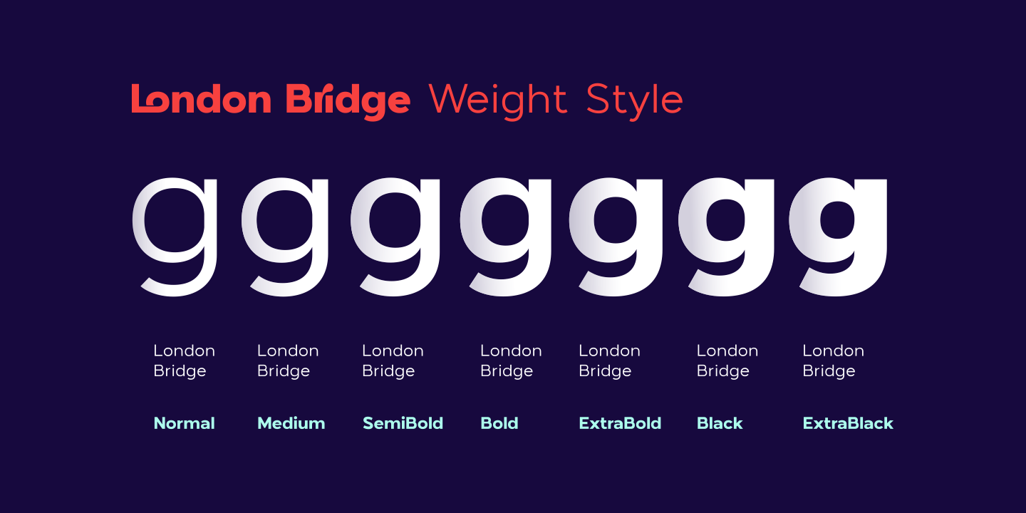 London Bridge là một Sans Serif hiện đại với nét đẹp và hình học. Nó có 7 kiểu. Mỗi kiểu bao gồm hỗ trợ ngôn ngữ mở rộng, phân số, thứ tự, chỉ số trên và hơn 30 chữ ghép. Được thiết kế với các tính năng OpenType mạnh mẽ, nó hoàn toàn phù hợp cho thiết kế đồ họa và bất kỳ mục đích sử dụng màn hình nào.