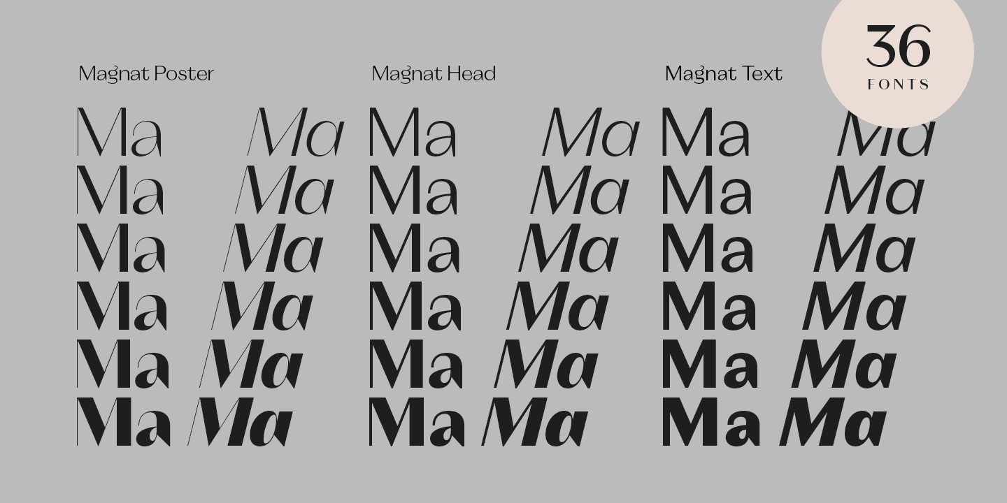 Magnat Font Family có sẵn với 36 kiểu font bao gồm cả chữ in nghiêng phù hợp, được chia thành 3: Poster, Head và Text. Mỗi loại đã được thiết kế cho phạm vi kích thước văn bản riêng của nó để dễ dàng tạo ra các thiết kế ấn tượng và phụ hợp.