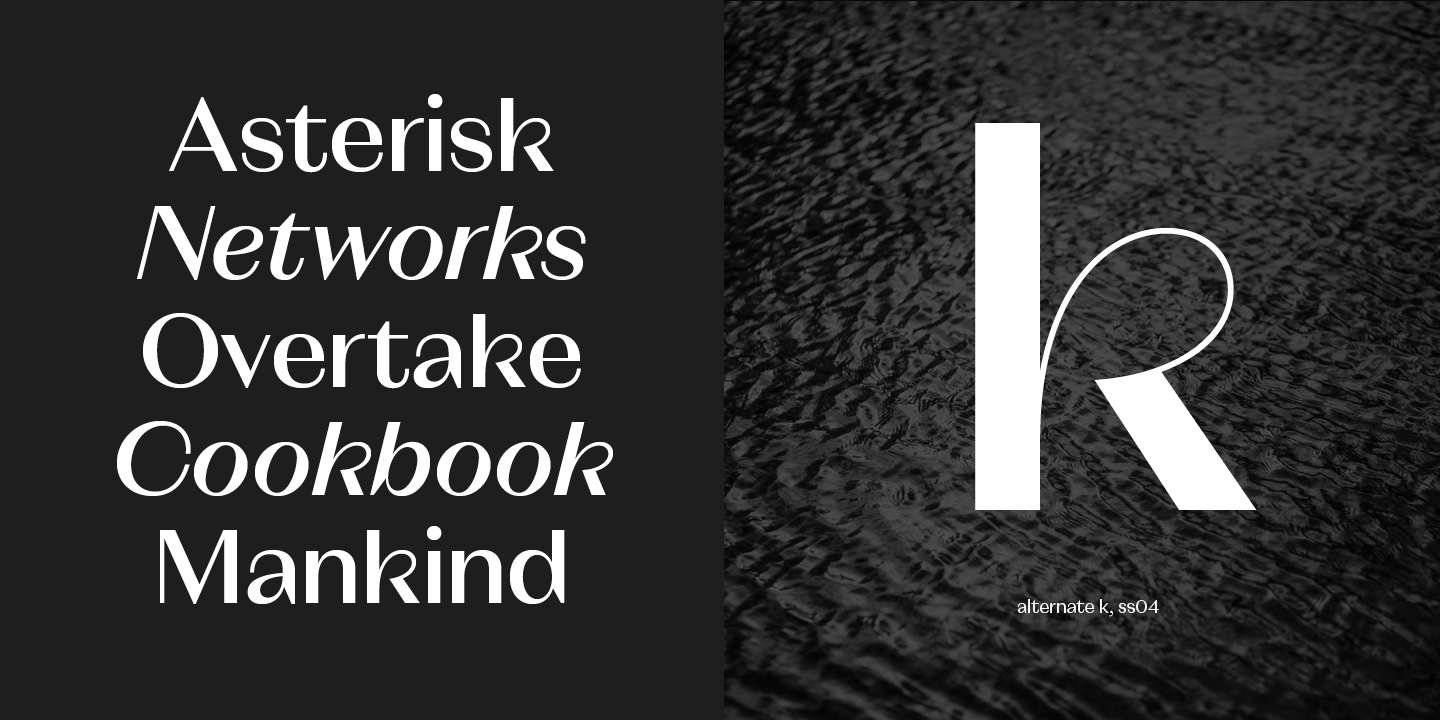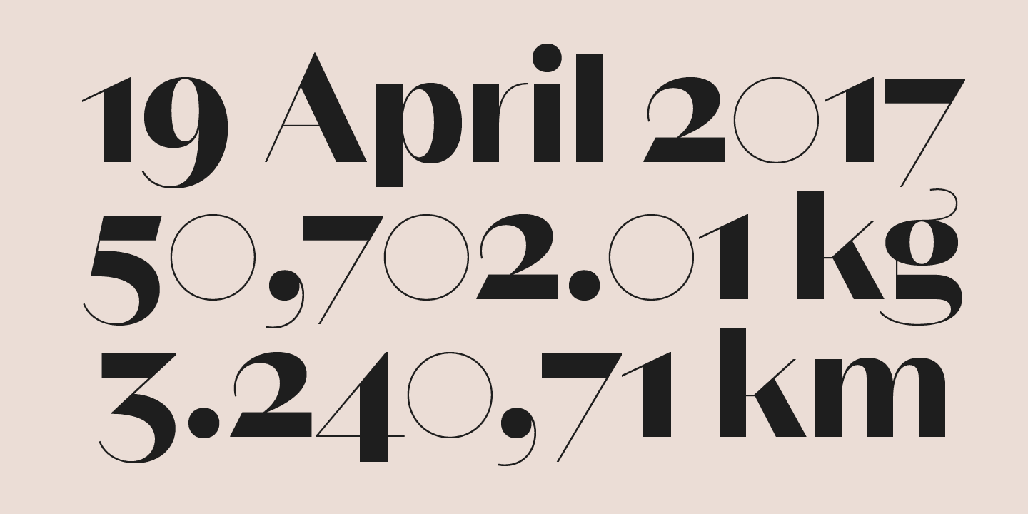 Mỗi kiểu phông chữ được trang bị nhiều tính năng opentype như các ký tự thay thế, các bộ số khác nhau hoặc các hình dạng phân biệt chữ hoa chữ thường, làm cho nó trở thành lựa chọn hoàn hảo cho thiết lập kiểu chuyên nghiệp trong xây dựng thương hiệu, biên tập hoặc thiết kế kỹ thuật số.