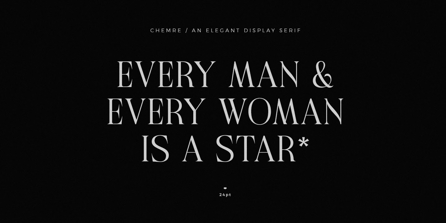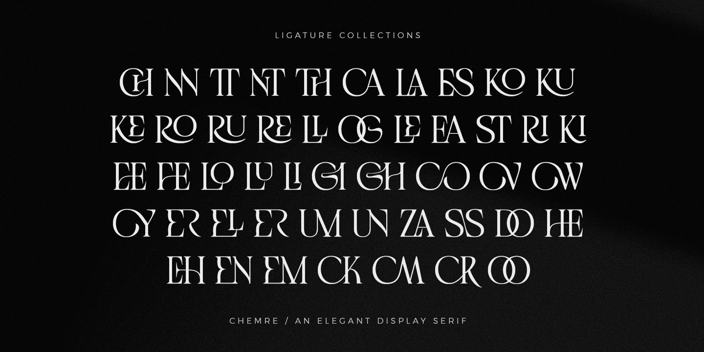 Chemre là một font chữ serif với thiết kế hiện đại và sang trọng. Font chữ này được bổ sung với sự kết hợp của tất cả các chữ hoa có cùng chiều cao và cho phép kết hợp không giới hạn để tạo phong cách độc đáo cho kiểu chữ của bạn. Độ tương phản cao giữa nét dày và nét mỏng mang lại cho Chemre vẻ sang trọng. Font chữ này có hai kiểu Regular và Italic. Chemre thích hợp cho áp phích, bao bì, thương hiệu, biểu trưng, tiêu đề và thiết kế biên tập.