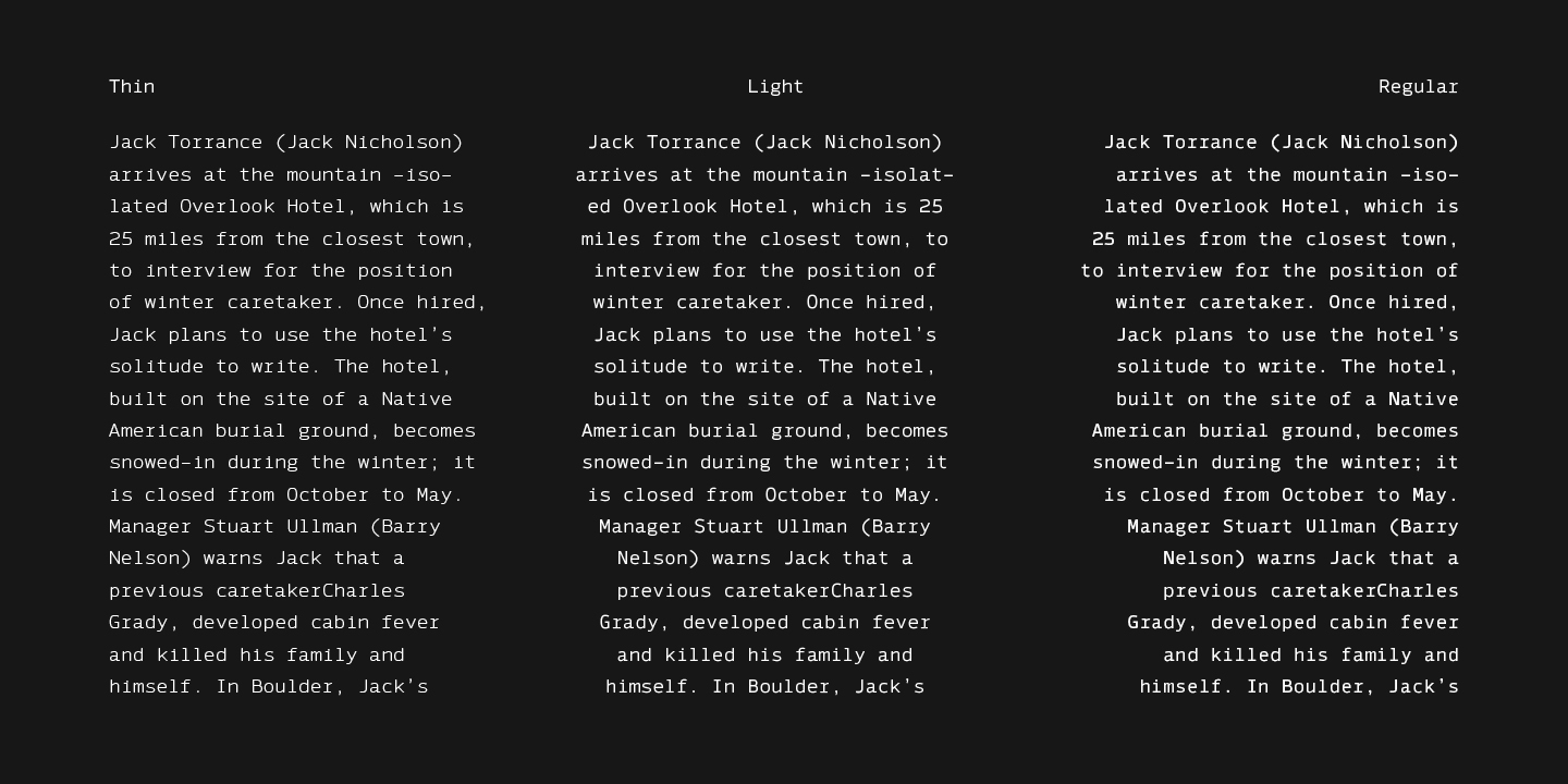 Syke Mono Font Family is a font family designed with a modern and striking style, ideal for desktop coding, database applications, e-books and other screen-based interfaces. The details include five weights and italics, over 590 characters with an alternate lowercase letter. Five digit variations, kerning and Opentype features are hand-edited.